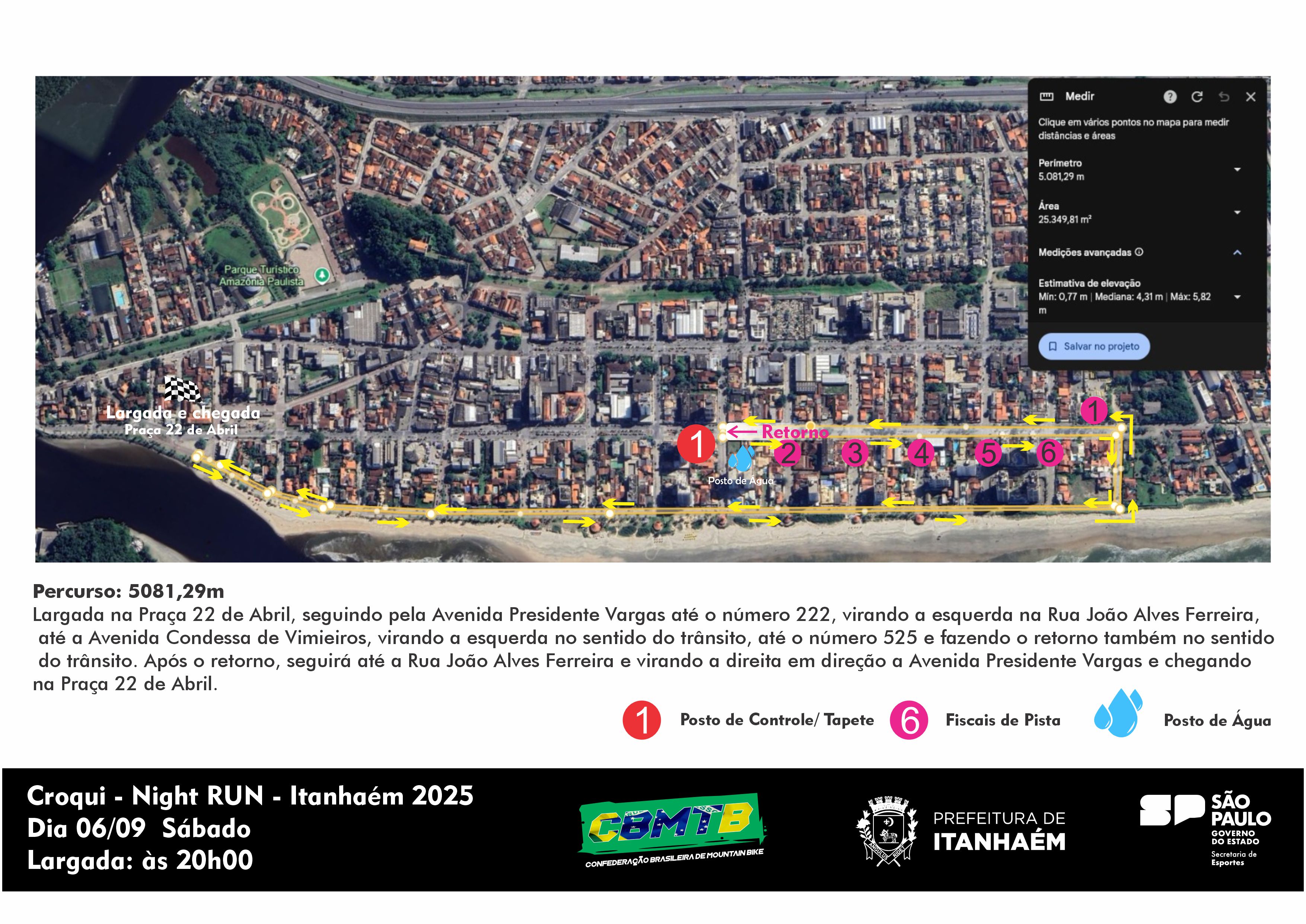 Art. 1º O Night Run 2025 - Itanhaém, é um evento promovido pela Confederação Brasileira de Mountain Bike (CBMTB), em parceria com a Secretaria de Esportes do Estado de São Paulo e a Prefeitura Municipal de Itanhaém – SP, a ser realizado no dia 06/09/2025 – Sábado a noite com largada às 20h00.
